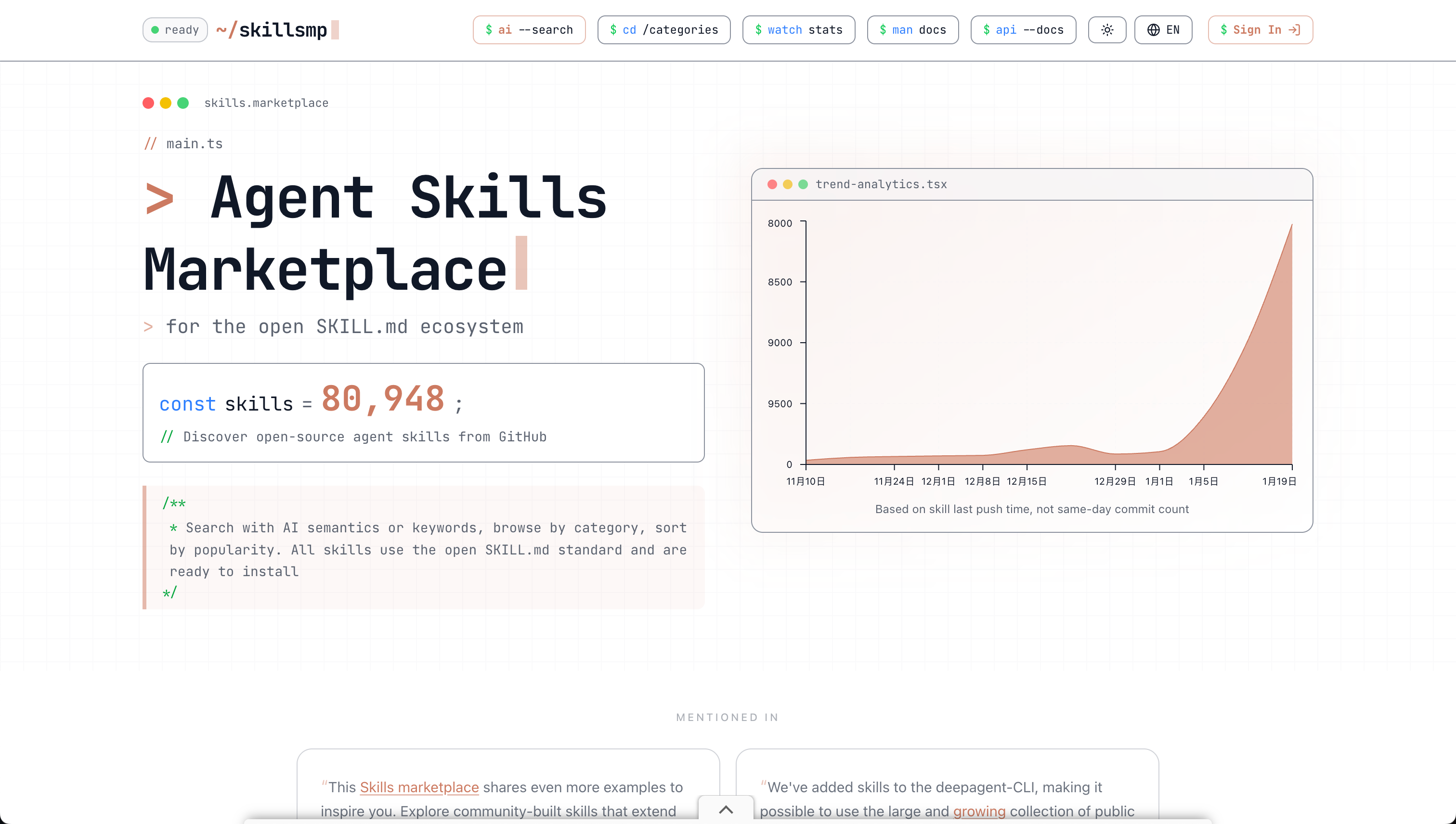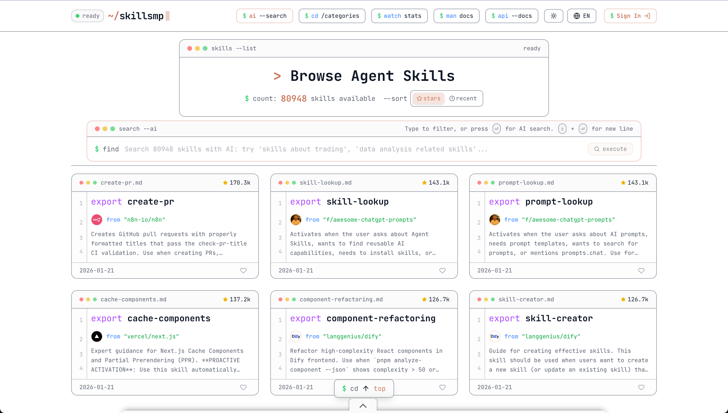 This Skills website indexes over 80,000 open-source Skills on GitHub, making it the website with the most Skills indexed to date. It supports AI semantic search and keyword filtering, as well as browsing by category and sorting by popularity.